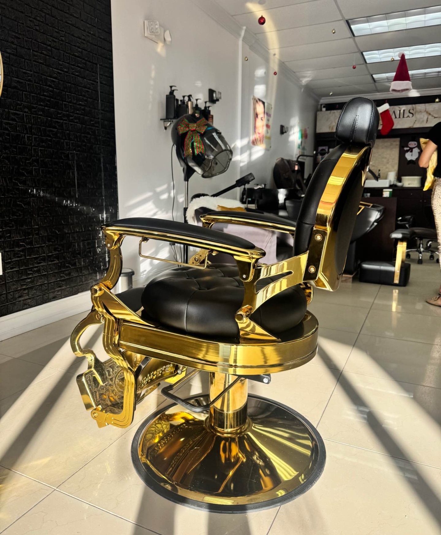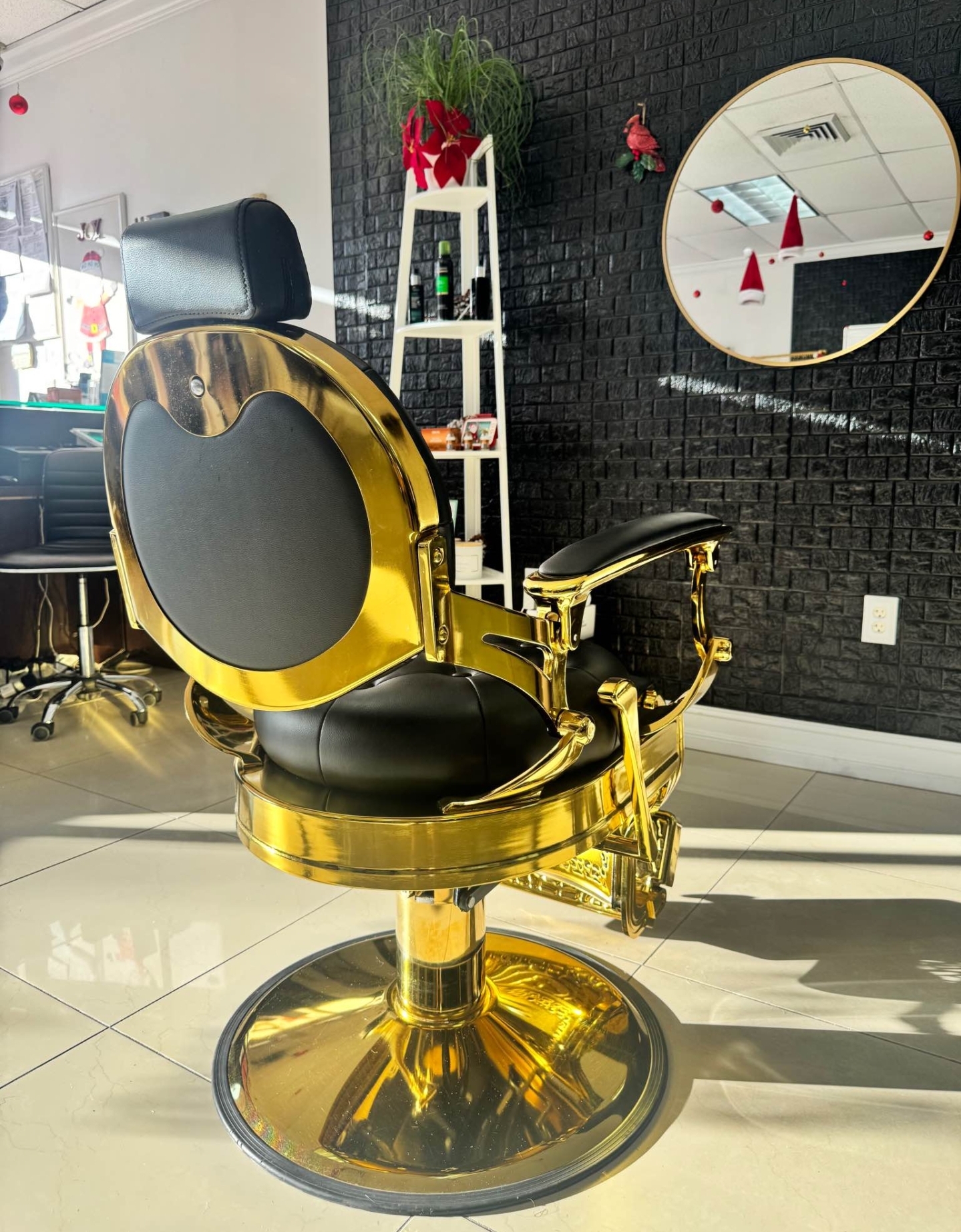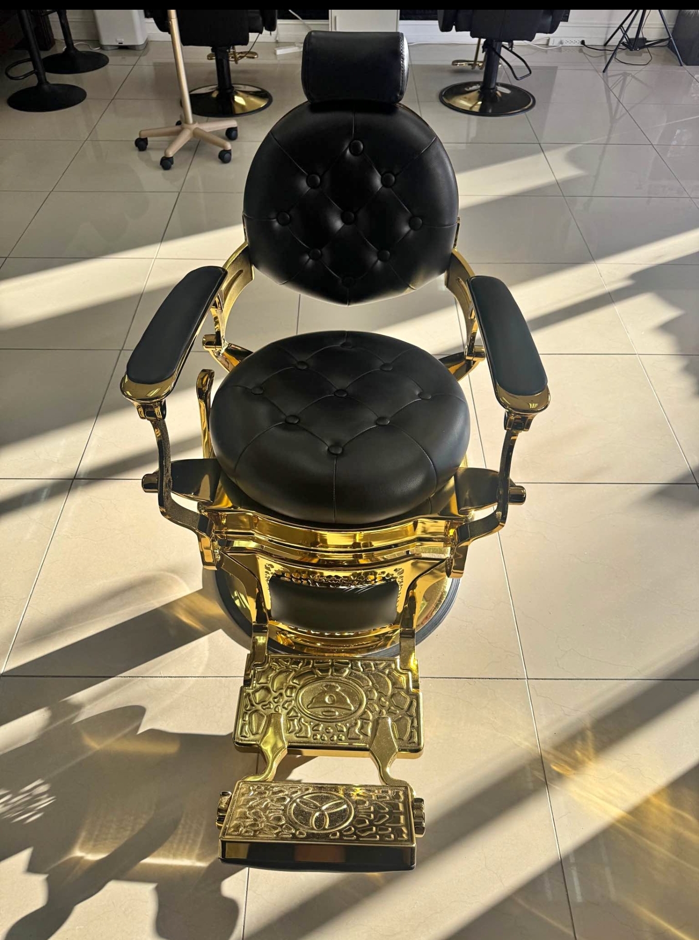 Bring style and professionalism to your event with our Luxury Barber Chair Rental, featuring a bold gold frame with black tufted cushioning. Perfect for photoshoots, barbershop pop-ups, grooming stations, brand activations, film production, commercials, fashion shoots, and special events, this premium chair instantly upgrades the look and feel of your setup.