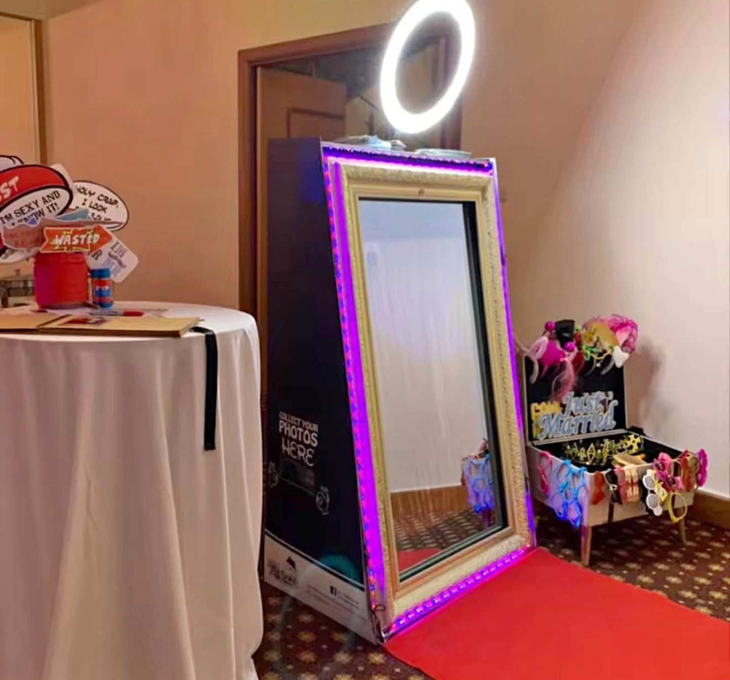 Guests can see themselves in the mirror, interact with touch-screen animations, take stunning selfies, and instantly print or share their photos. The Magic Mirror Booth includes a red carpet, fun props, and customizable photo templates—making every moment picture-perfect!