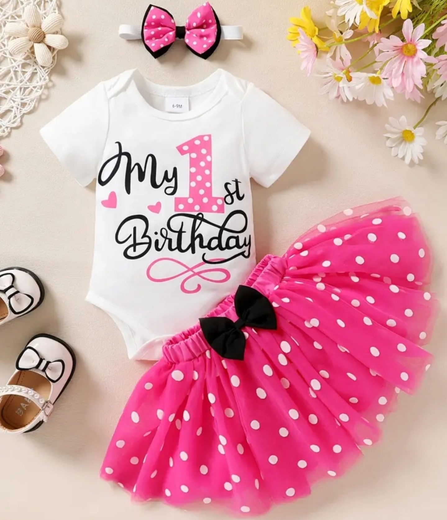 Toddler Baby Girls 1st 2nd Birthday Outfit Mini Polka Dots Romper Tutu Dress Mouse Ears Headband Princess Skirt Set for Photo Shoot 1 Year Hot Pink